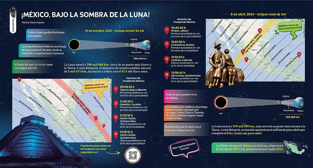 Se avecinan dos eclipses solares, ¡y serán visibles en México! Prepárate y conoce los detalles para disfrutar del eclipse anular de Sol (que sucederá el 14 de octubre de 2023) y del eclipse total de Sol (que sucederá el 8 de abril de 2024).